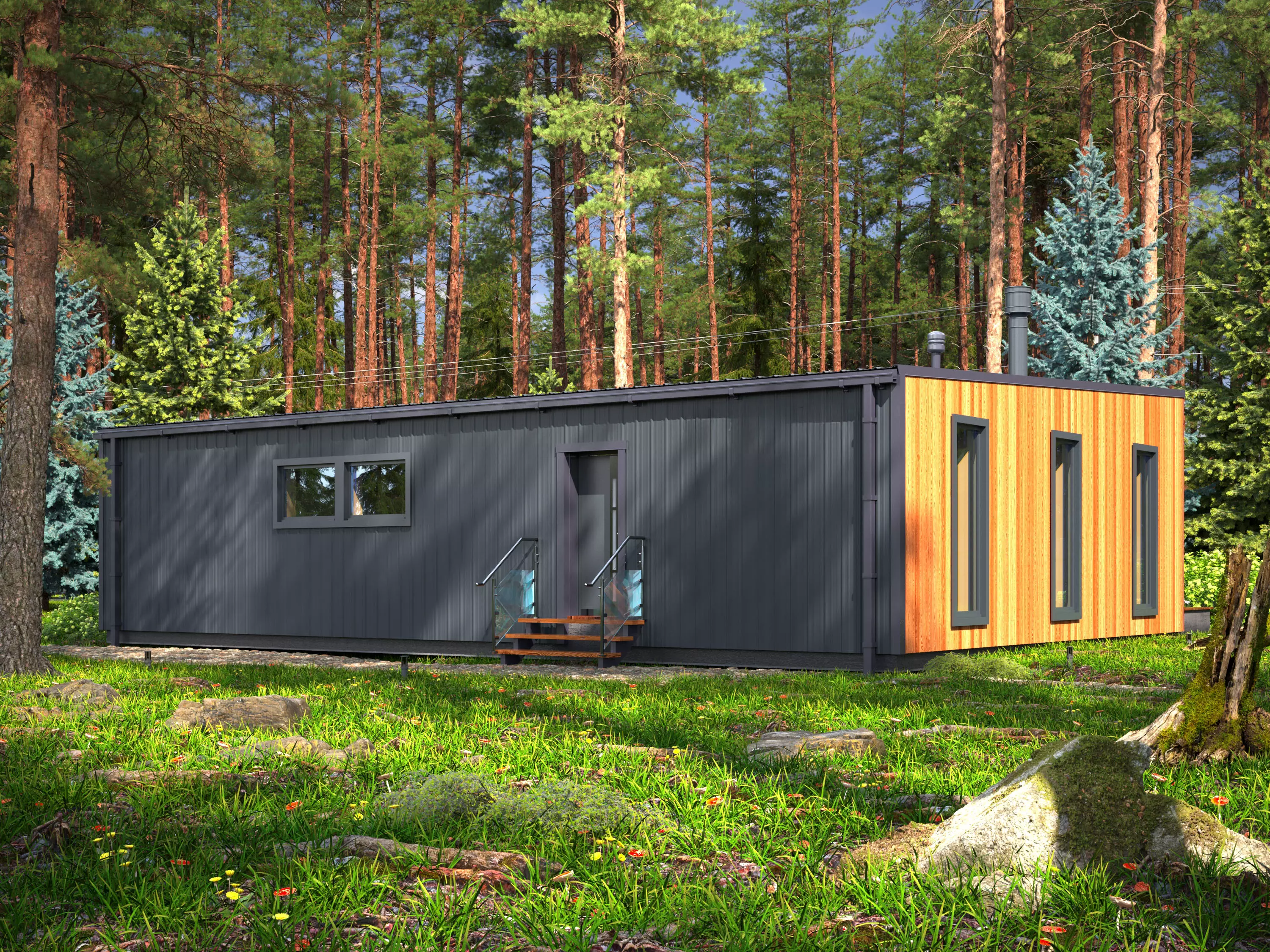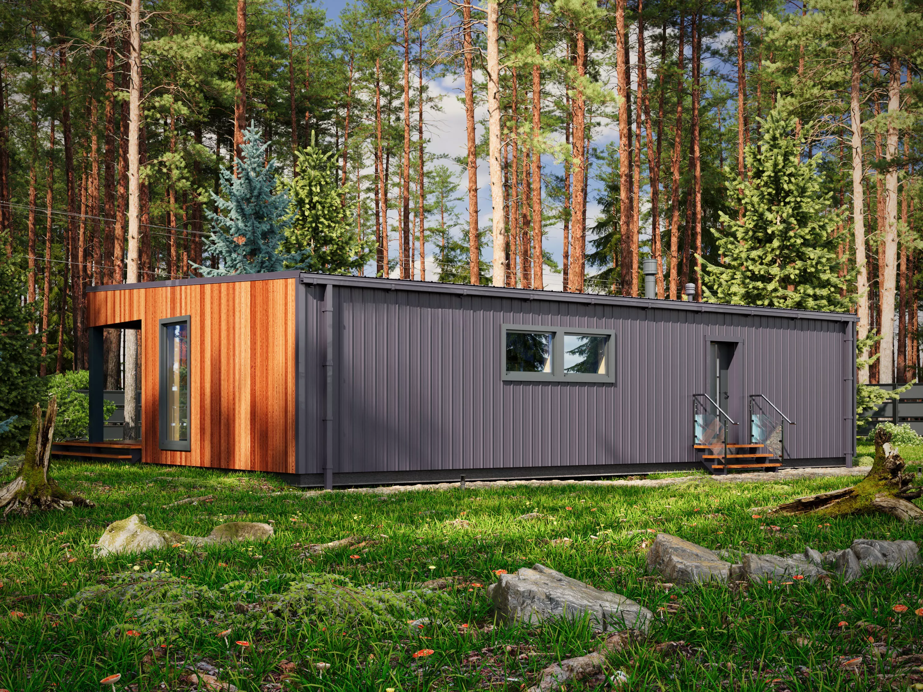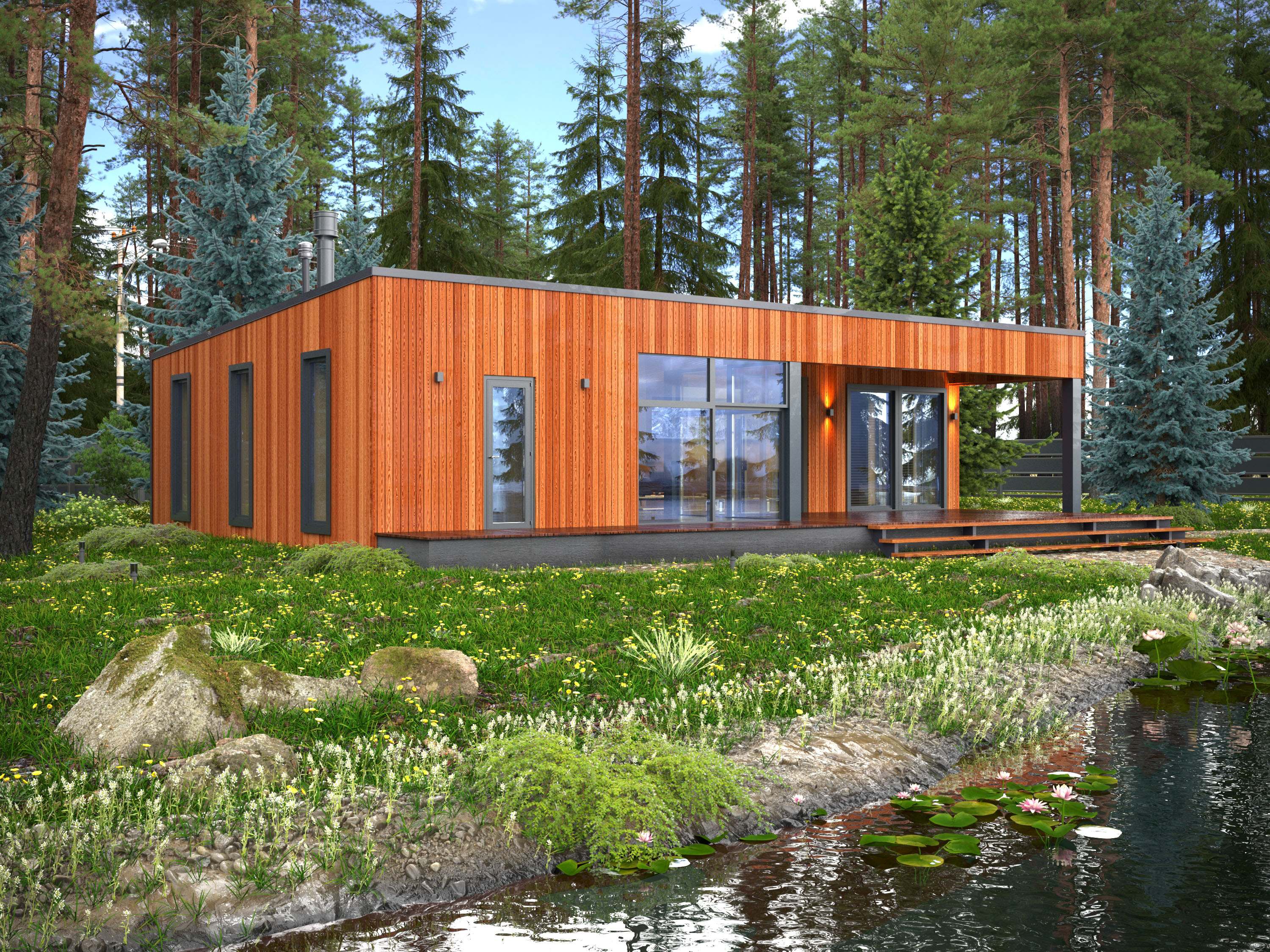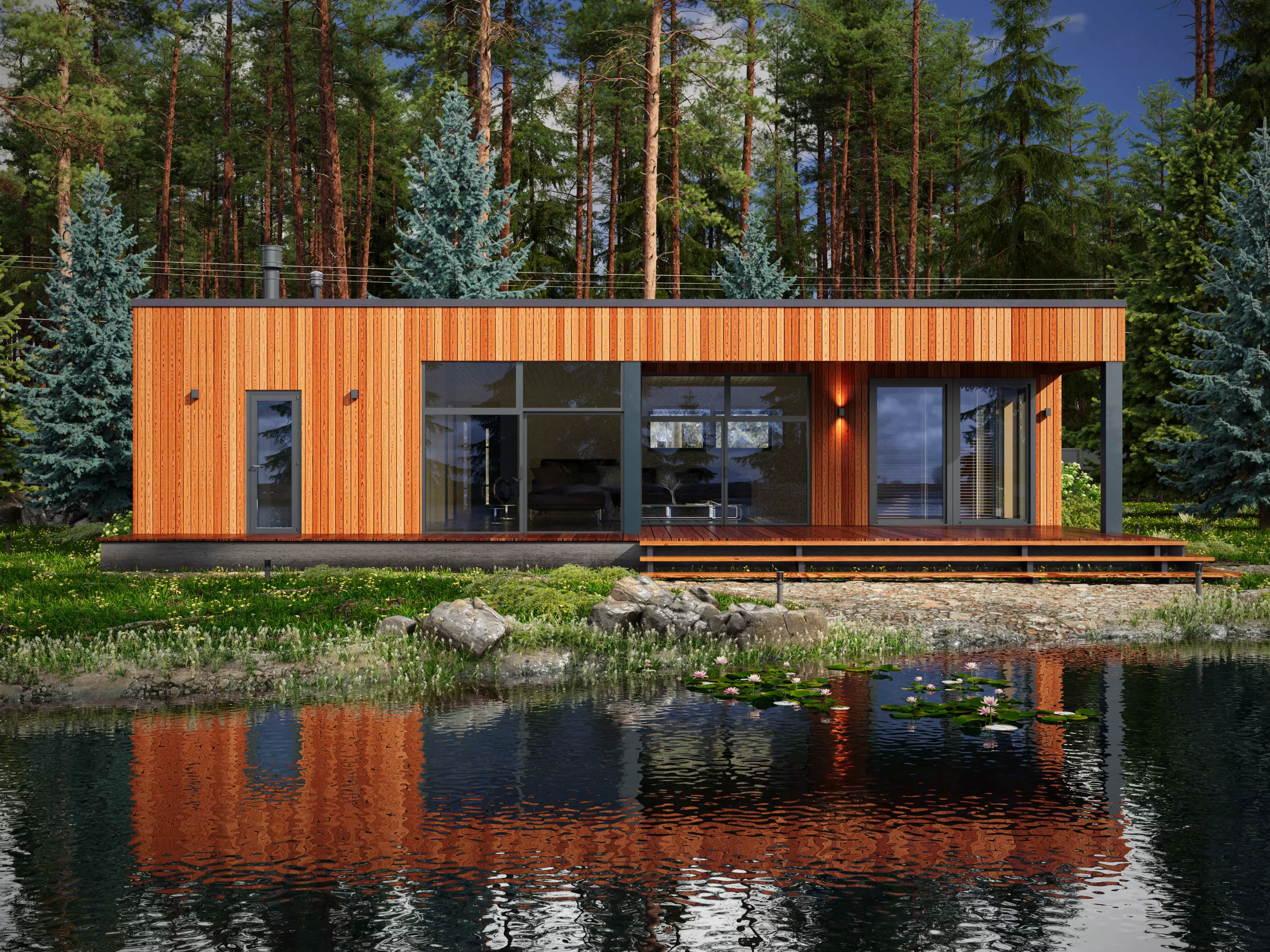 Пропорции вытянутого объёма подчёркивают горизонталь и создают ощущение устойчивости. Центральная часть раскрыта к ландшафту через широкое остекление, в то время как боковые фасады более закрыты и камерны. Архитектура выстроена на балансе открытости и приватности, где каждая грань работает на ощущение целостности.