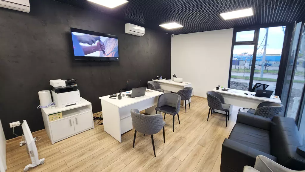 Внутри пространство продумано для комфортной работы: есть рабочая зона для сотрудников, зона приёма клиентов и санузел. Пол покрыт износостойким ламинатом, стены отделаны гипсокартоном с покраской, а витражные окна наполняют помещение естественным светом.